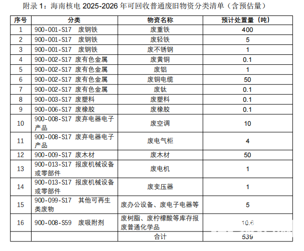 3. 废旧物资分类以“附录 1 海南核电 2025-2026 年可回收普通废旧物资分类清单”为准。